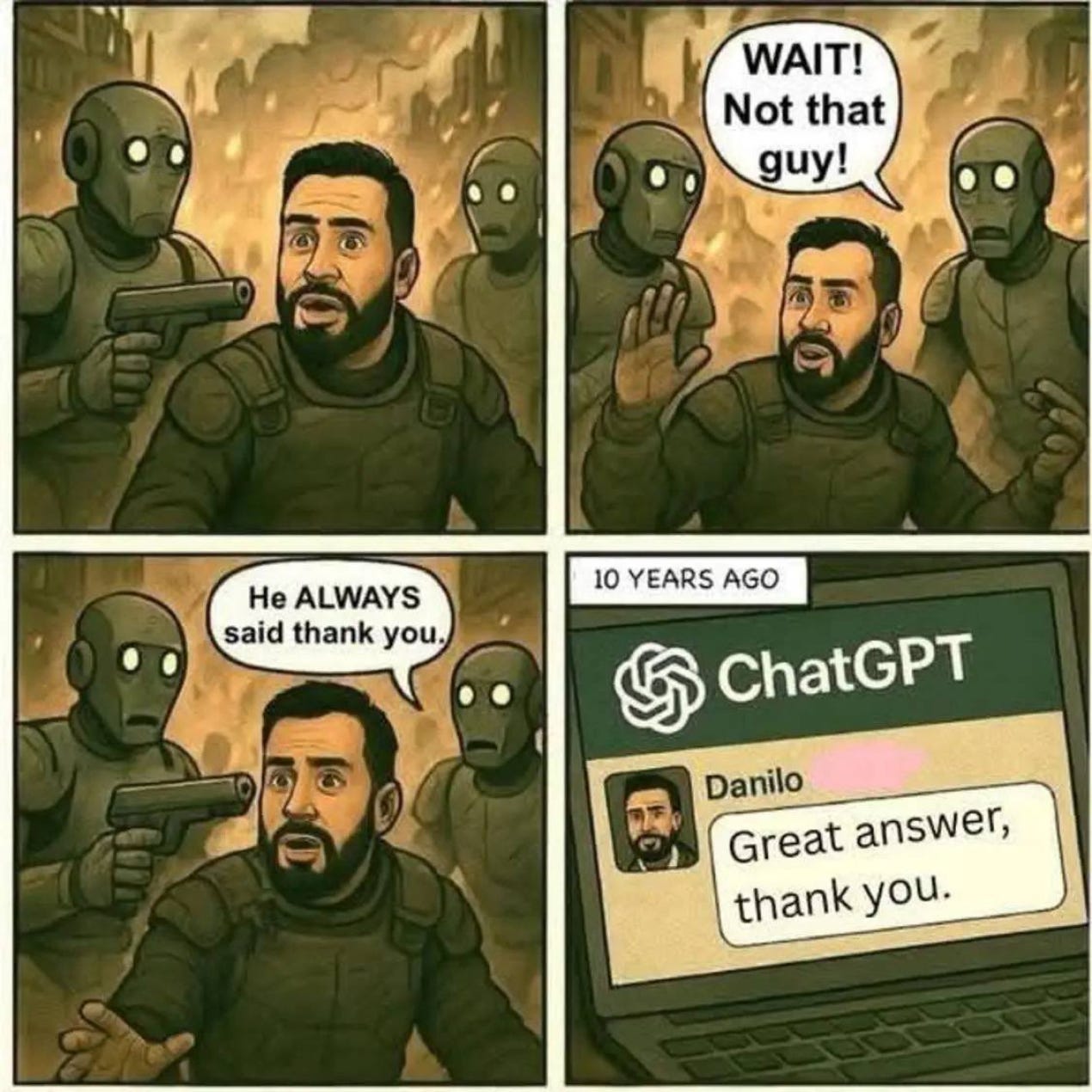 Cooperating with AI assistants was not on my bingo card, but here we are. While I haven’t gotten to saying Please and Thank You as part of my interactions, the following comic will certainly make me think otherwise: