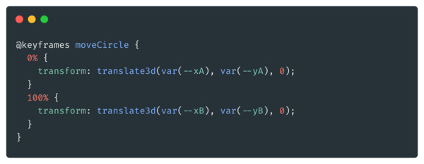 Custom properties have been around for a long time now. They replicate the reusability power of variables found in languages like JavaScript and bring them into CSS. What makes them relevant for animations is that custom properties can live inside our keyframes.