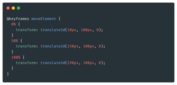 Animations are all about visualizing a state change from a before and after. CSS animations represent this world by having you explicitly define what the before and after states look like via @keyframes style rules. These rules contain the individual keyframes themselves that specify what visuals will change at which point in the animation’s life.