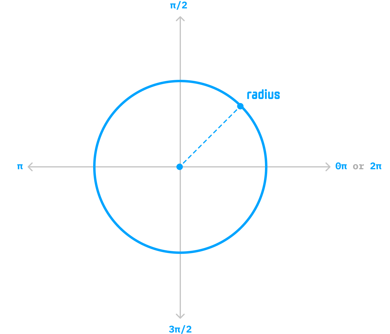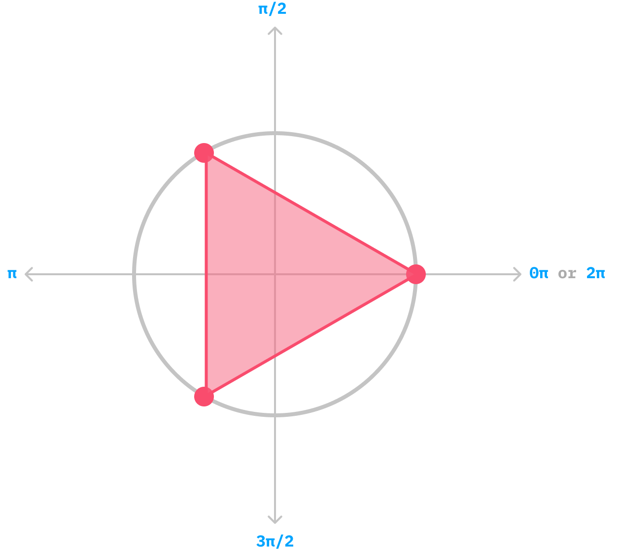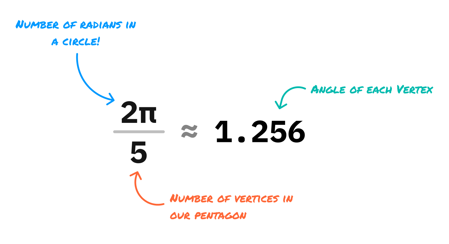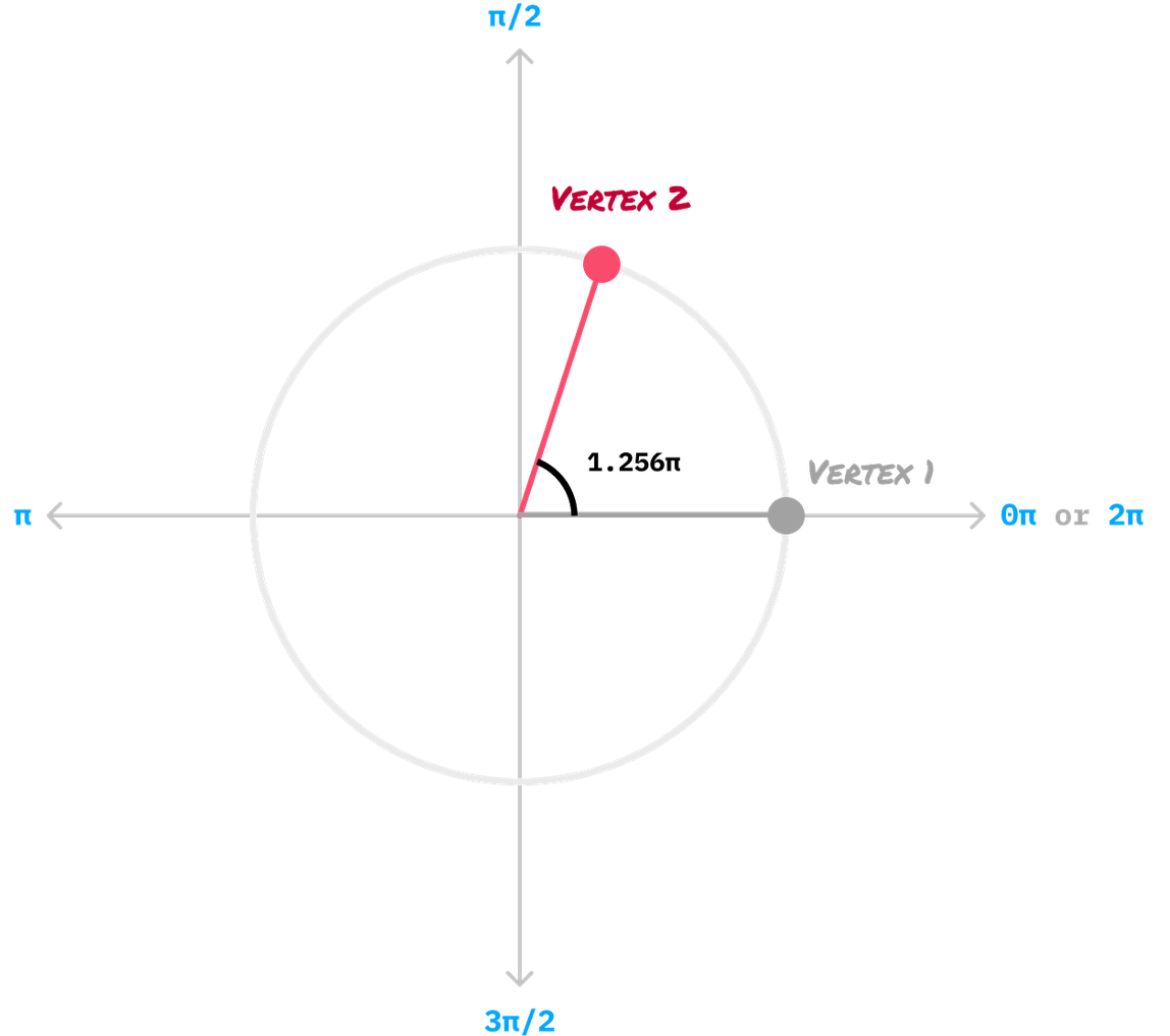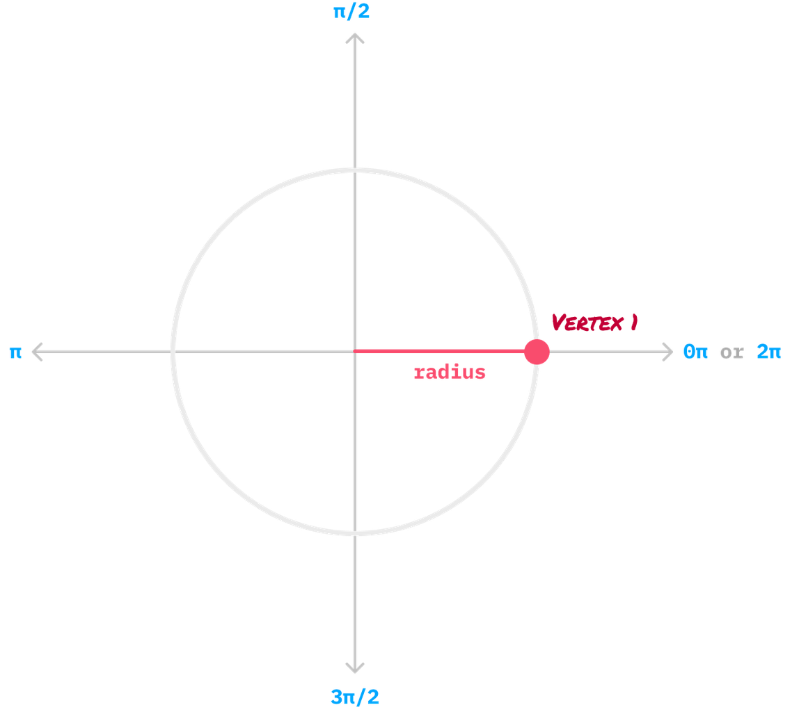 With our vertex angle now in hand, it is time to define our vertices. The first vertex will always be at an angle of 0 radians: