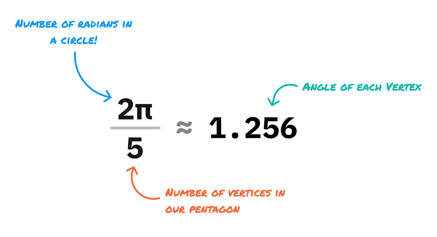 From here, we are one step closer to placing our vertices on the circle. Our next step requires a little bit of math, where we calculate the vertex angle. We find this angle by dividing the number of total vertices in our shape by the total number of radians in our circle, which is 2ฯ. For our pentagon, the calculation will look as follows: