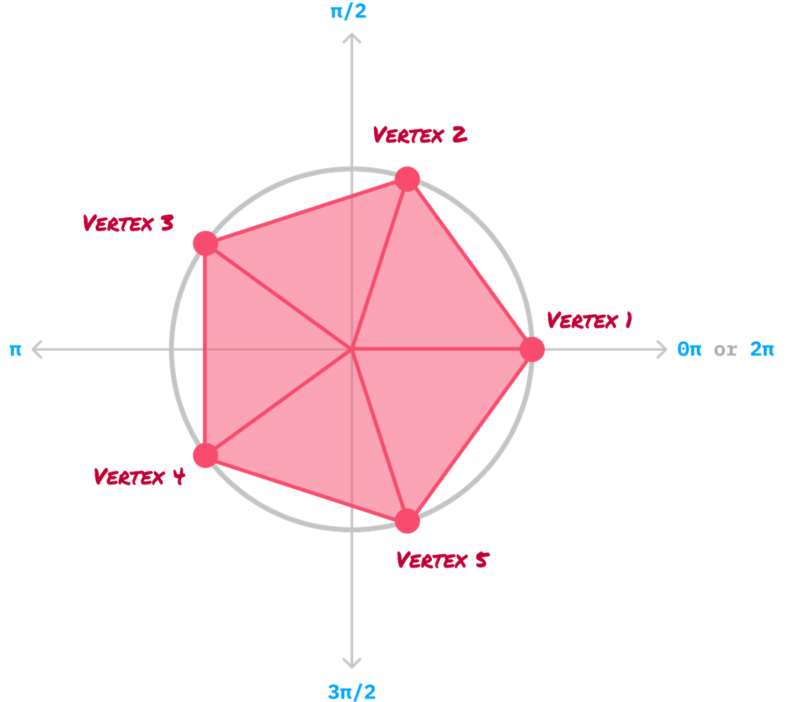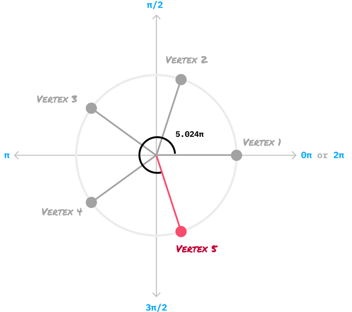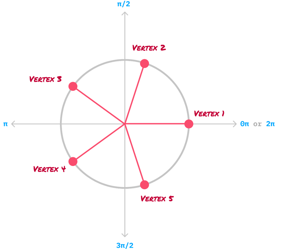 Just like our other vertices, Vertex 5 is positioned on our virtual circle. Its exact position is determined by its angle, which is 4 times 1.256 or...5.024.ย Putting this all together, the end result of all of our vertices being drawn looks as follows:
