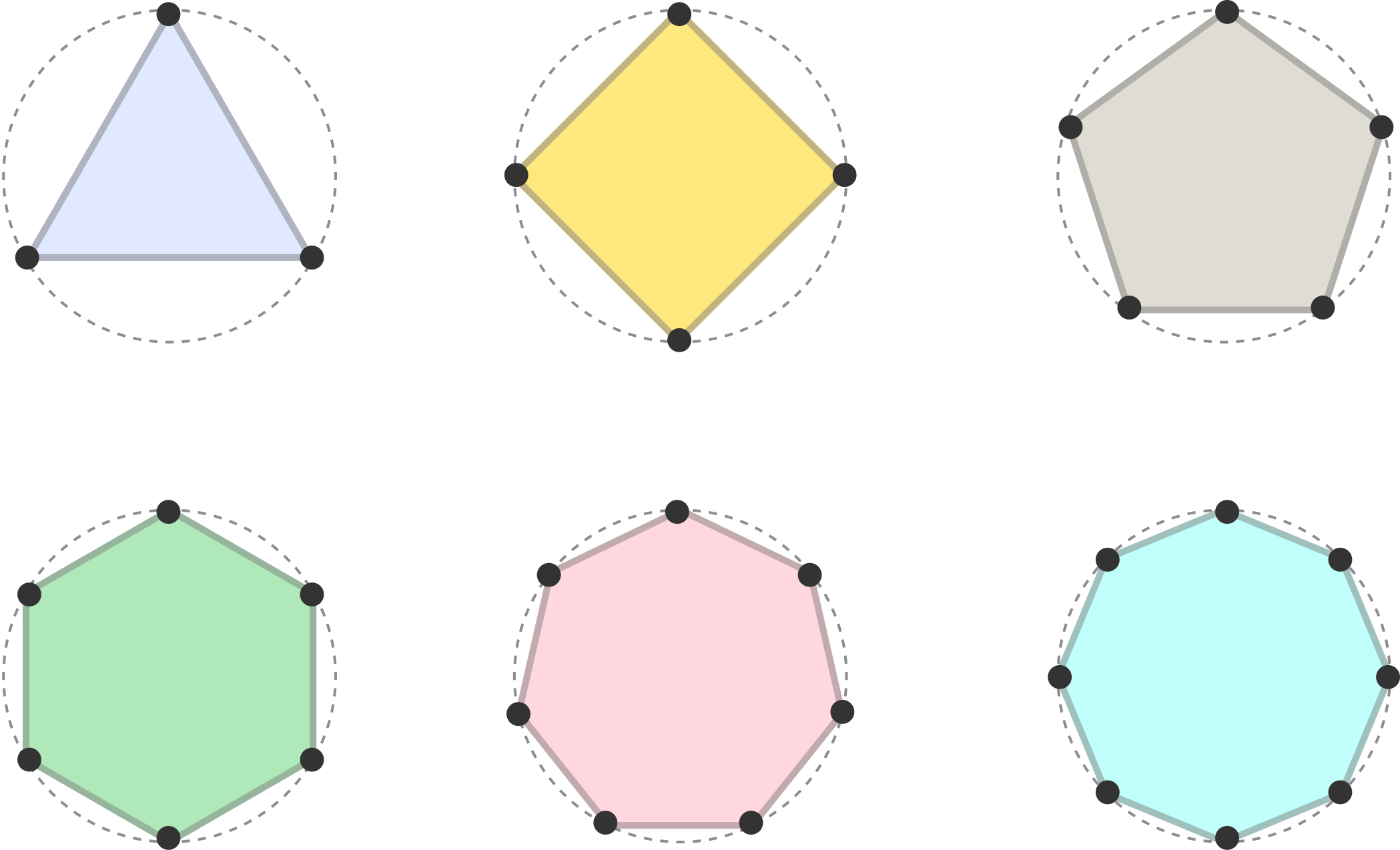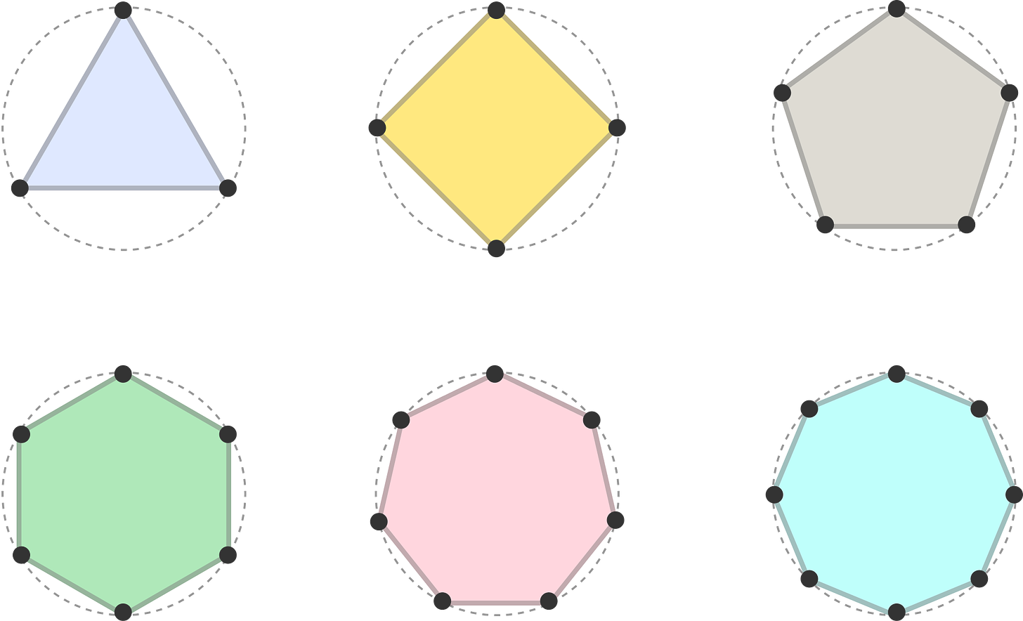 In our generalized approach, we draw our polygons by mapping our shapeโs number of points (aka vertices) onto equally spaced positions on a virtual circle: