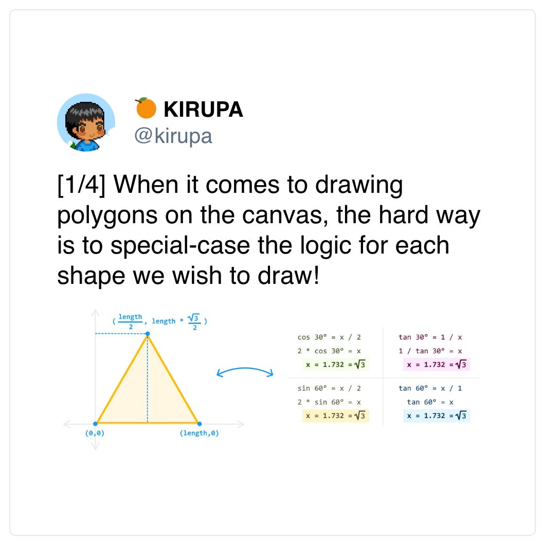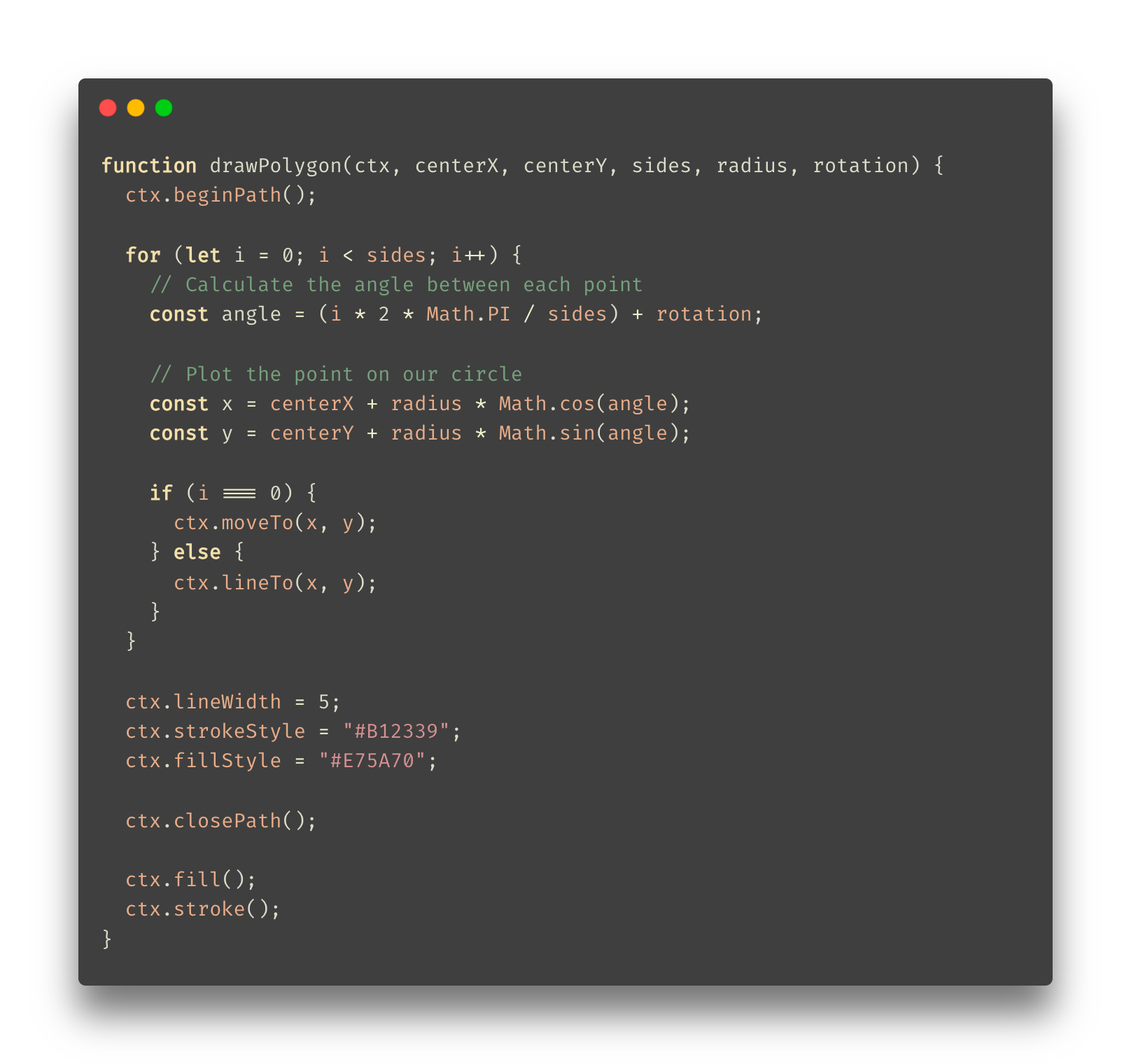 Now that weโve seen our generalized approach for drawing our pentagon shape, all that remains is turn all of this knowledge into lines of code our browser can understand. Meet the drawPolygon function: