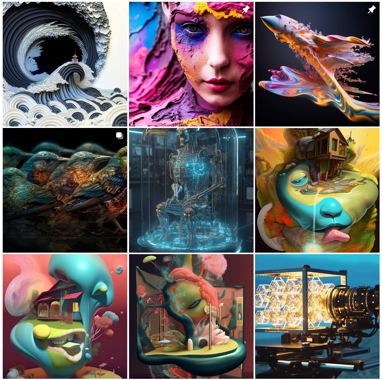 Walkthroughwonder combines AI-generated art with his own image manipulations to create very unique results that are a mixture of human and machine. You can catch my interview with him to learn more about how he uses AI to take his already otherworldly design skills to the next level!
