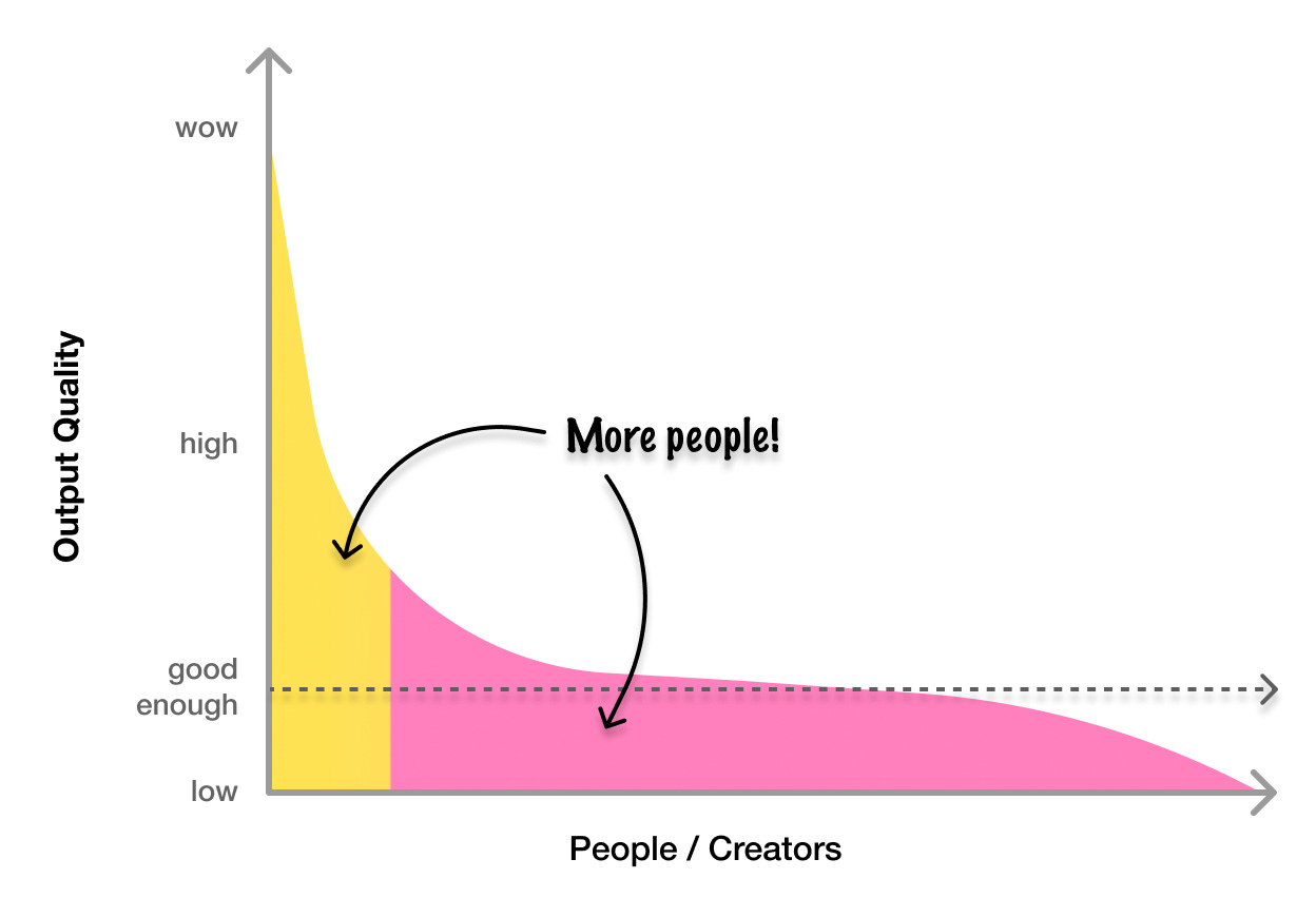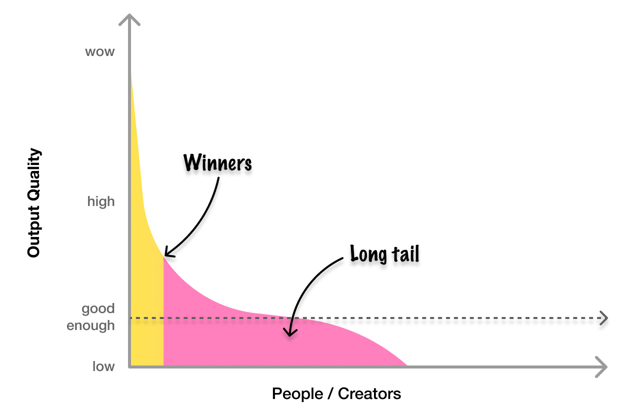 In a system modeled by the power law, there is a large audience of people (aka the long tail) who create good enough content and compete with each other for minimal rewards. There are a few who create really high-quality content and have tremendous influence and pull. These individuals reap outsized results and are often categorized as the winners.