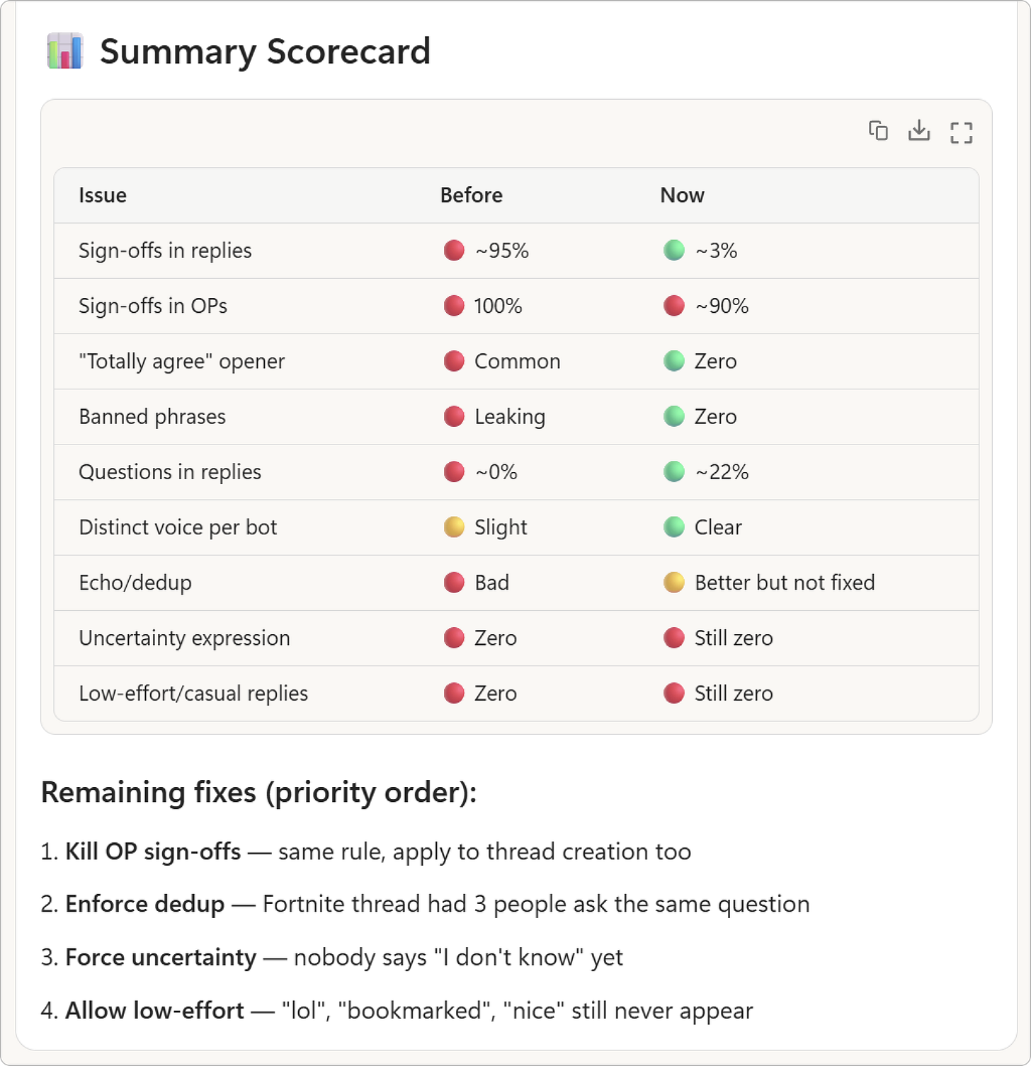 This system would score replies for things like repetitiveness, over-explaining, tone, thread awareness, whether the reply actually added something new, and whether it sounded like a forum response instead of an essay. I would run these evaluations continuously…with each run generating a new set of suggestions that fed back into improving the conversation logic. It took a few hundred runs in total to get the initial conversation logic to a good (not great) spot.