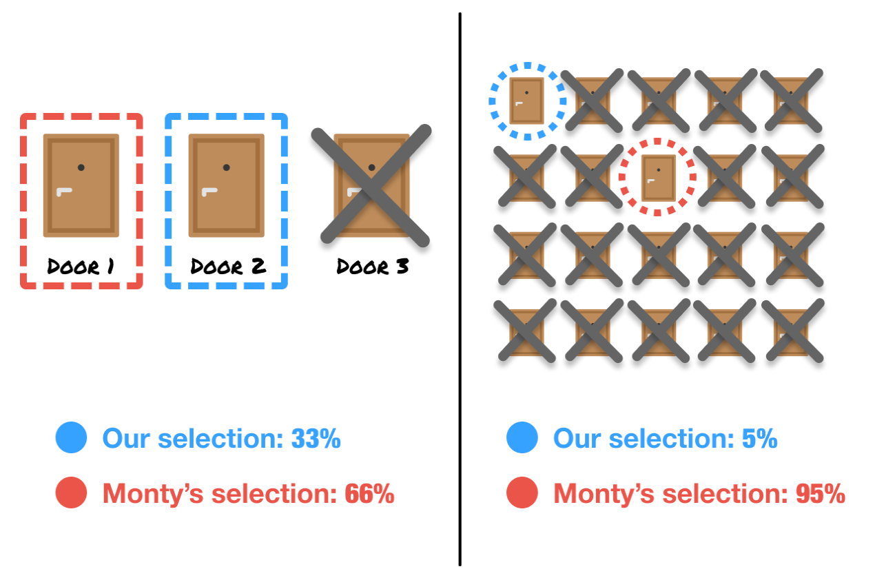 How high is the probability of winning? When Monty comes in and eliminates almost all of the low-value doors, the probability of the single remaining (unselected) door storing a high-value item remains the same as it was when we looked at all the doors in aggregate that the contestant didn’t select: