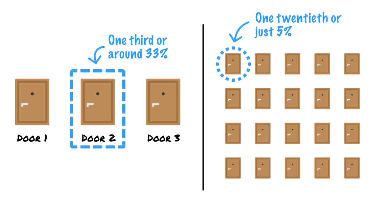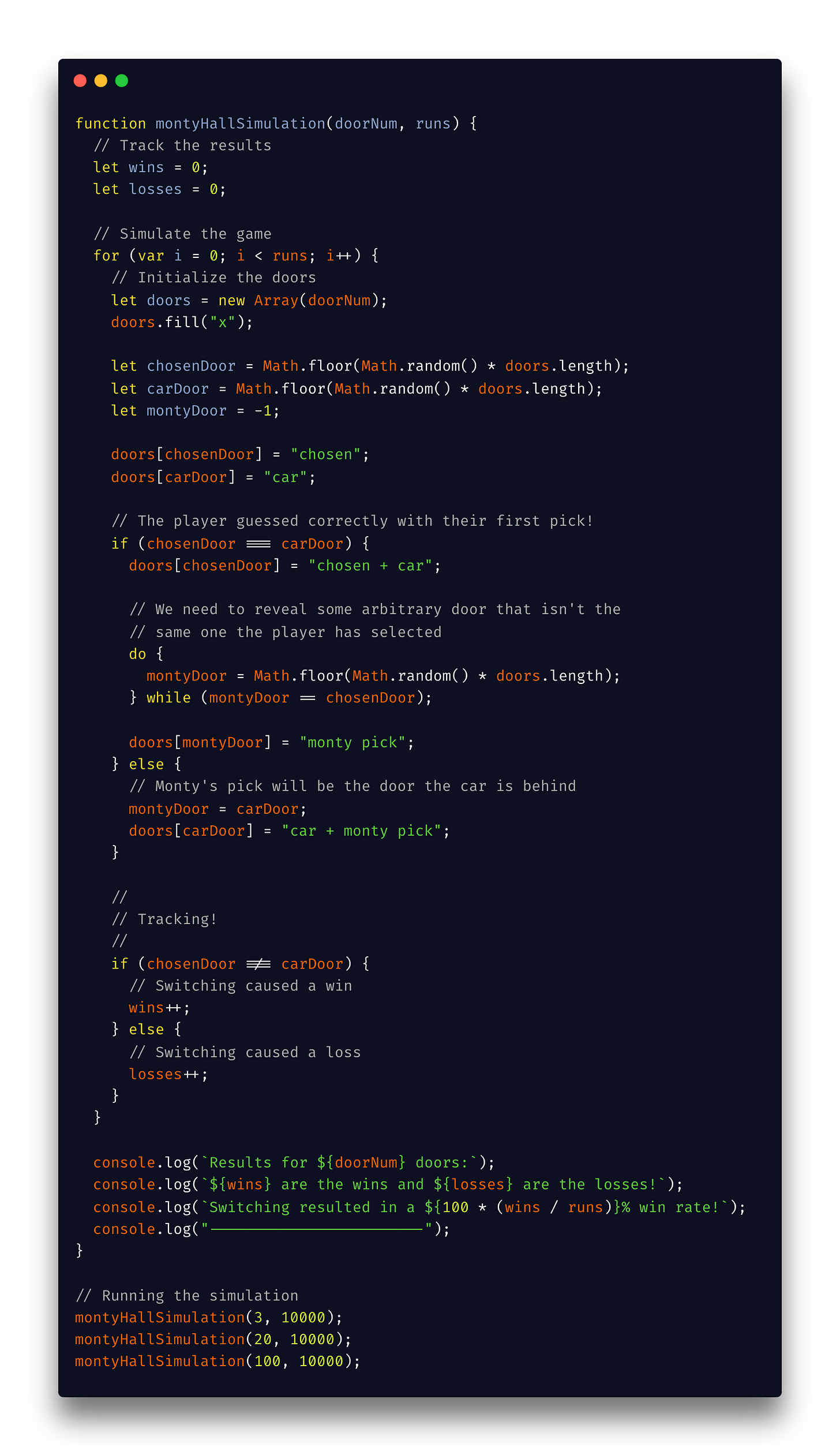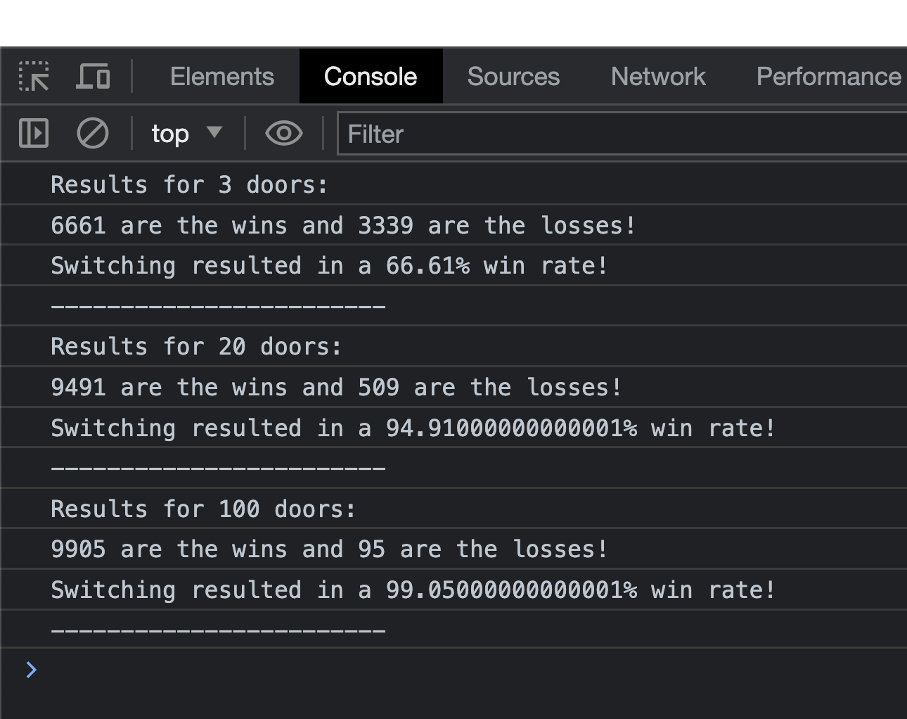 Notice how the real-world numbers very closely match the numbers we predicted in our Monty Hall Problem deep-dive. For three doors, switching resulted in a win rate of around 66%. For 20 doors, switching resulted in a winning rate of around 95%. For 100 doors, the win rate was around 99% when switching. Really cool, right?