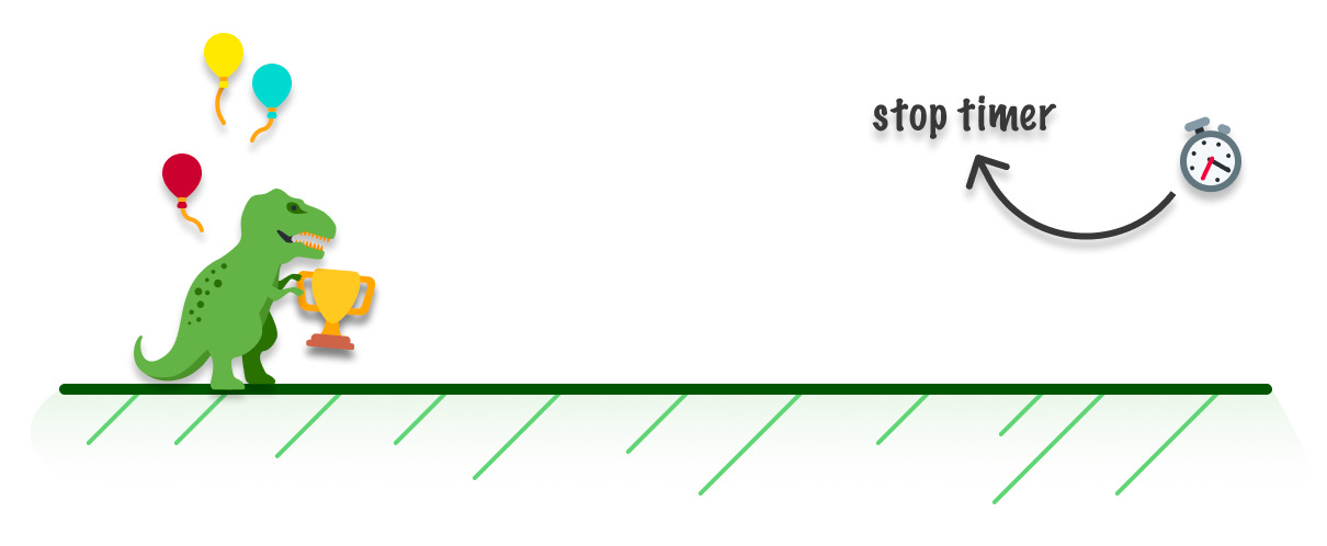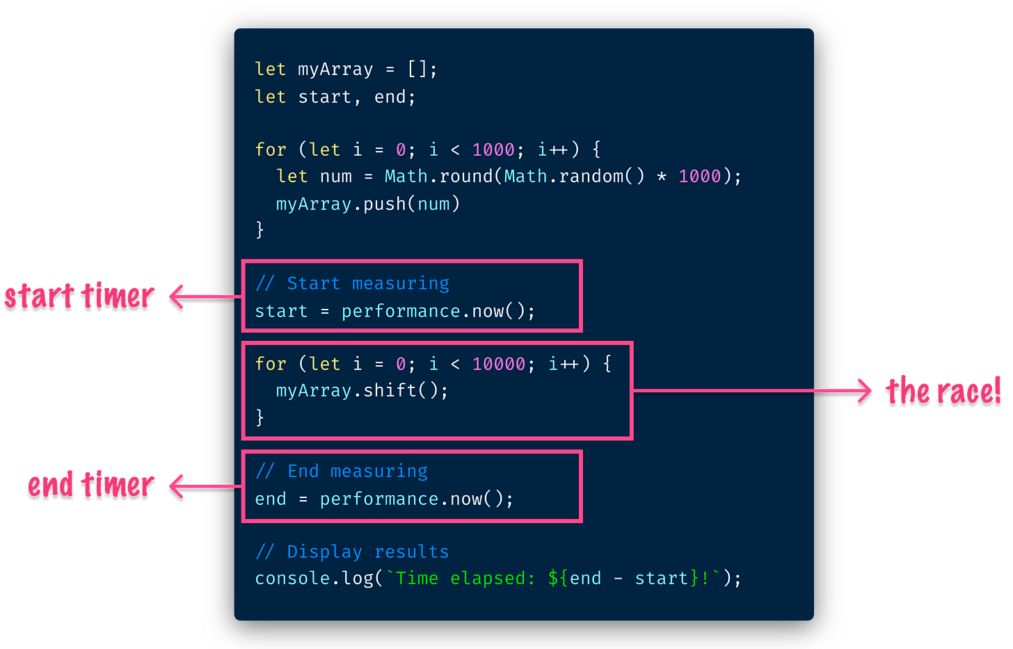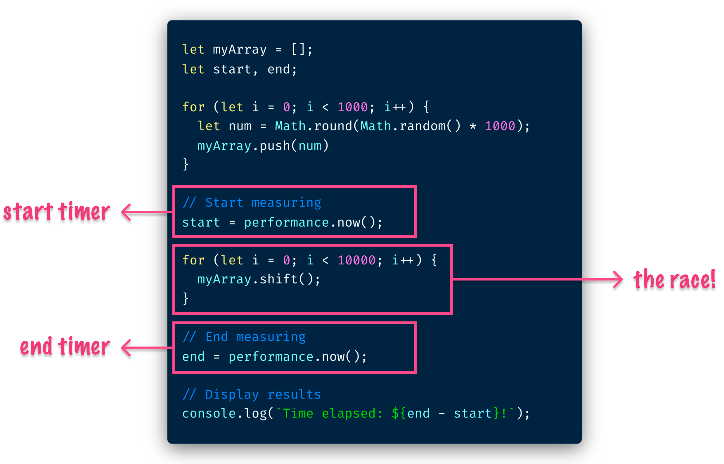 performance.now(); //Timestamp is: 8960.69999999553The code whose performance we want to measure is like our race. If we call performance.now() before our code runs and call performance.now() again after our code (whose performance we want to measure!) runs, we have two moments in time whose difference is the time it took our code to run.