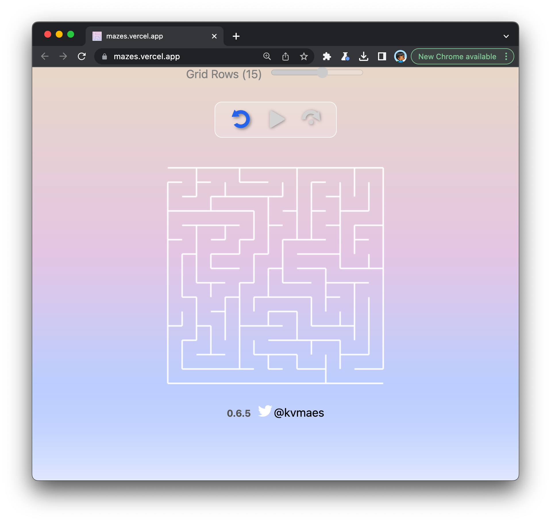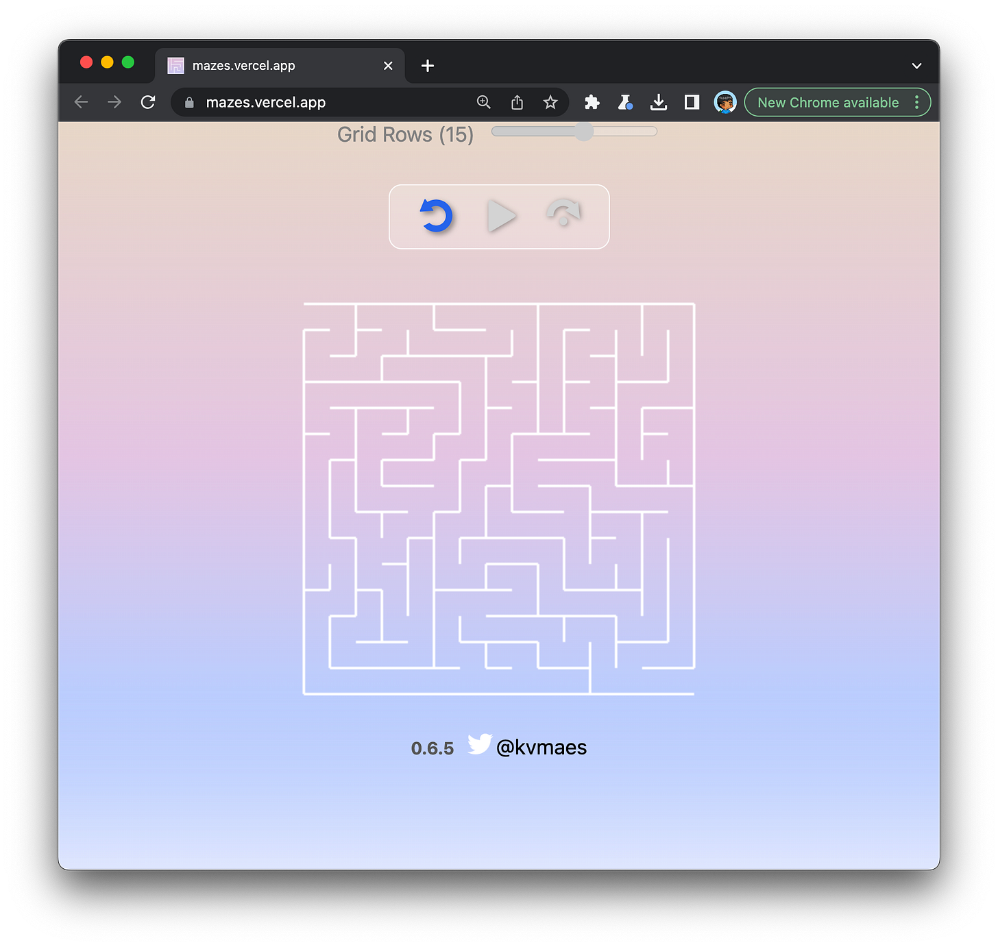 I shared a while ago that I am working on a beginner-friendly book on Data Structures and Algorithms. The challenge with this topic is that much of what we learn is foundational. Itโs more about learning how to build the actual LEGO bricks as opposed to cooler things built using the LEGO bricks. Maze generation is one of those rare topics where the distance between learning about the underlying implementation details and playing with the final result is quite small, so it was great to see Kevinโs implementation and discussion during our chat.