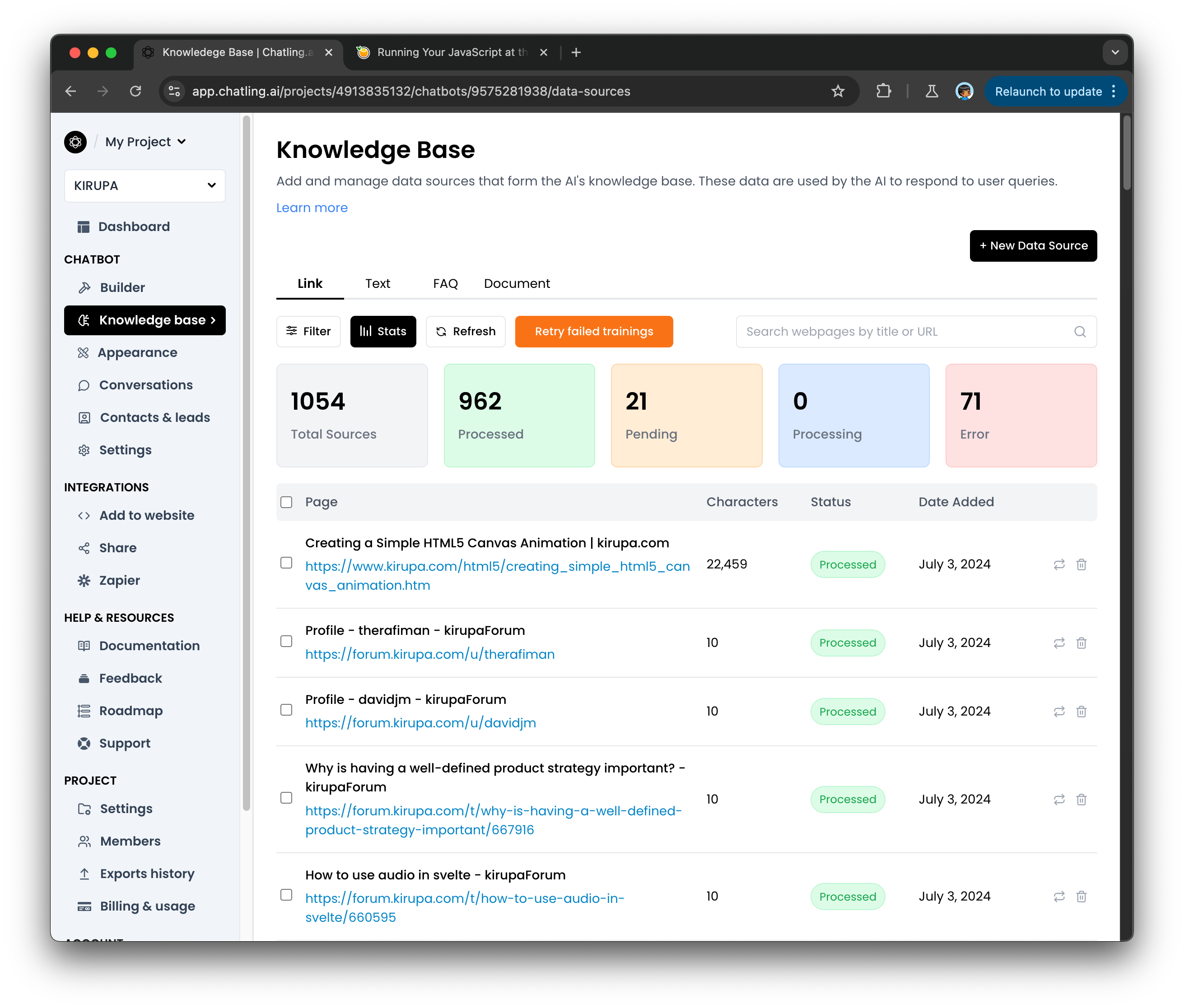 I had the Chatling service do a URL crawl, but I also submitted a sitemap of my most popular content. I have not submitted the forums themselves to the chatbot yet. With over 2 million posts, that might be something I handle later.