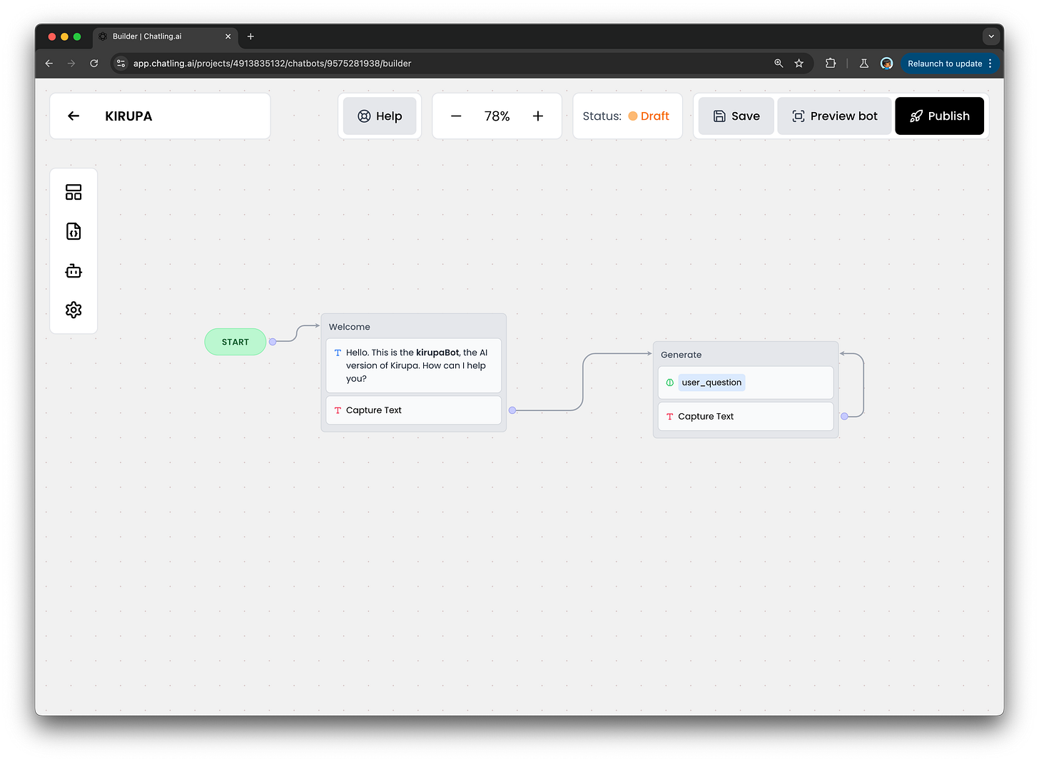 Getting this chatbot up and running took about 30 minutes. I used the friendly interface provided by Chatling to describe my bot’s prompting behavior: