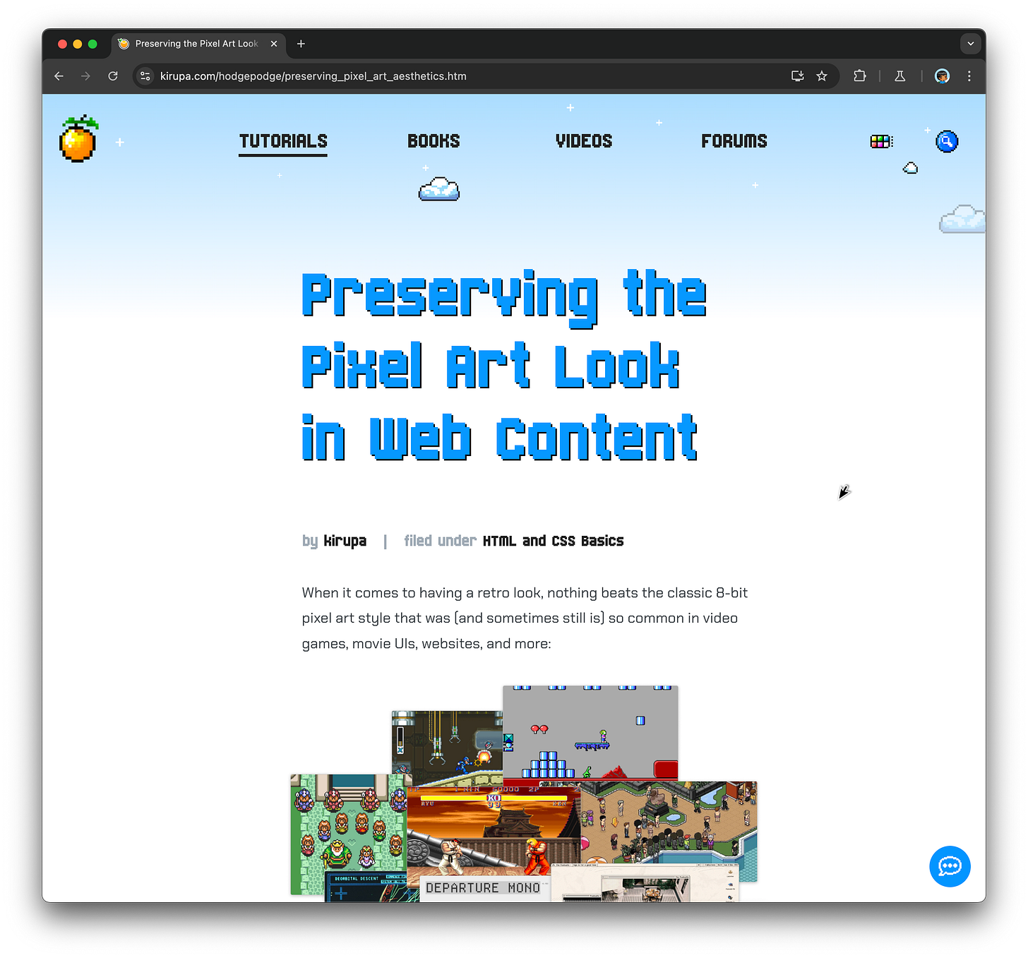 If for some bizarre reason the article doesn’t help, feel free to just inspect the CSS on the main KIRUPA site. All of the techniques I outlined are ones I used to get the pixel art-inspired look that you can see.