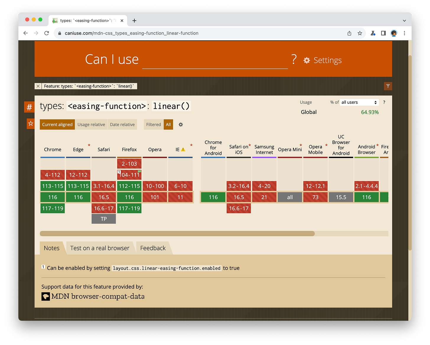 Chrome, Firefox, and Chromium-based browsers like Edge support it. Safari (and all browsers on iOS) don’t support the linear() timing function yet, so we need to provide adequate fallbacks: