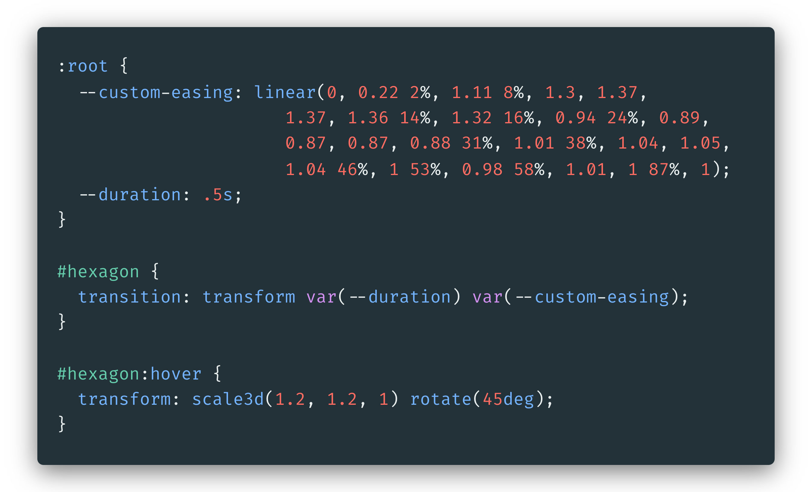 Introduced recently, the linear() timing function gives you and I nearly full control in defining every detail of how our timing function needs to behave. For the full rundown on what the linear() timing function is and how to use it, this article from the Chrome team is fantastic.