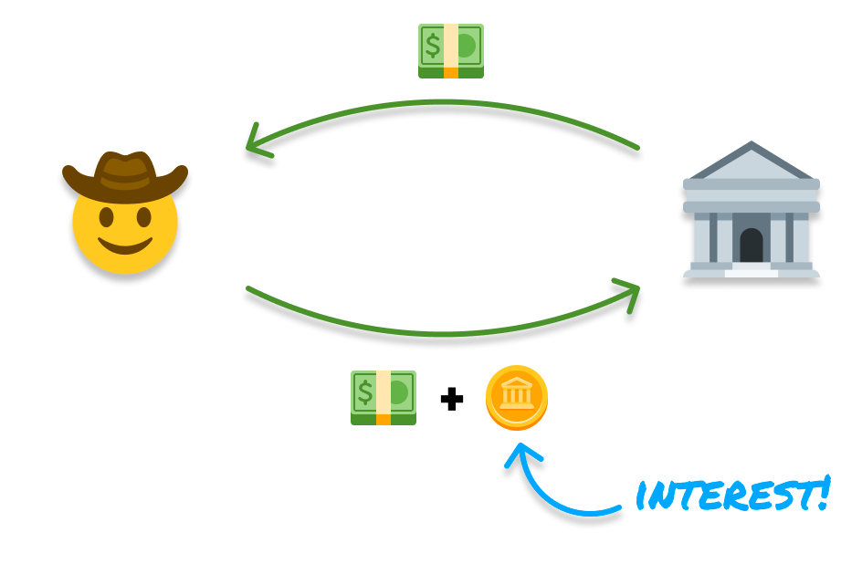 For example, the bank may charge us an interest rate of 10% to borrow $1000 from them. This means when we pay back the bank, we pay both the originally borrowed amount ($1000) as well as an additional $100 ($1000 x 10%) as interest: