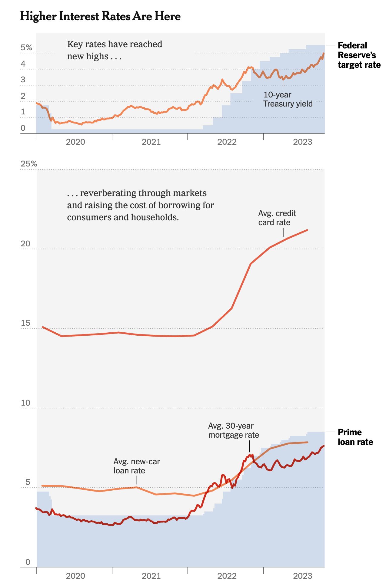 Over the past few years, the Federal Reserve has been drastically increasing the Federal Funds Rate, which has, in turn, increased the interest rate we see for everything from business loans, car loans, home loans and more as highlighted by the following visual from the New York Times: