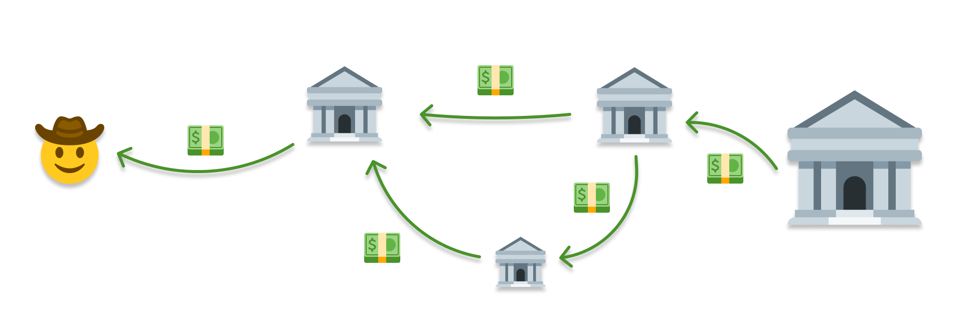 Getting back to our example, it is highly likely that our bank doesn’t have $1000 of its own money easily available to lend to us. What it does is borrow that amount from another bank, which may, in turn, borrow from another bank:
