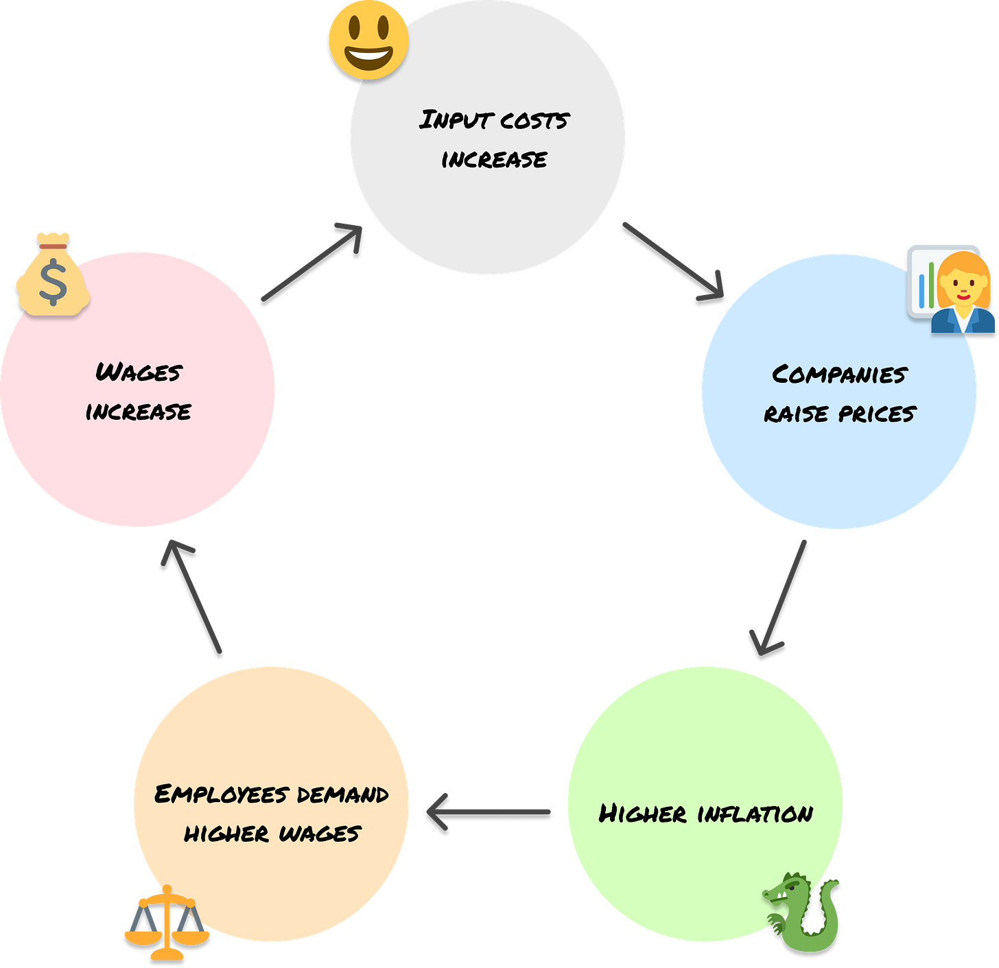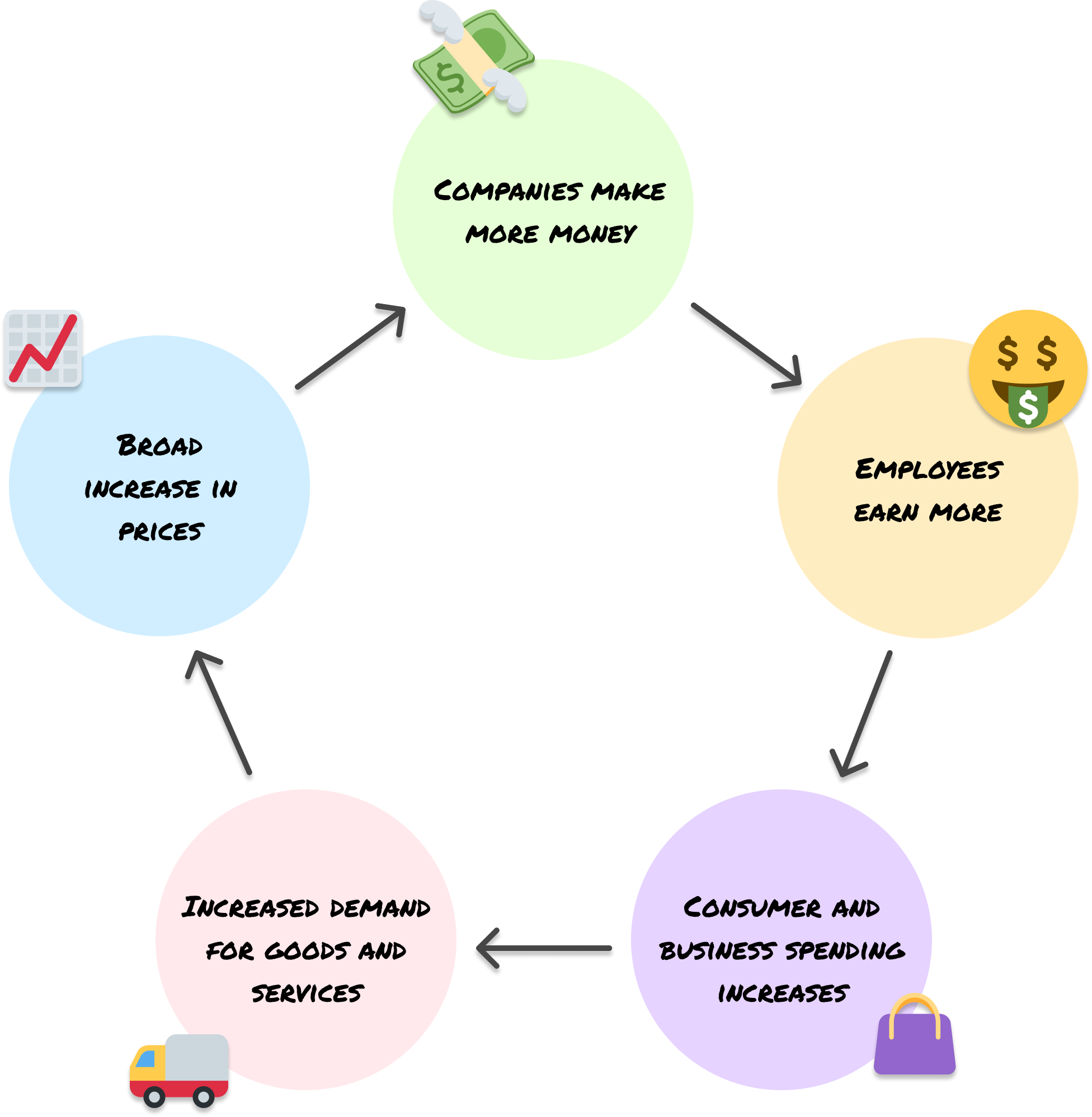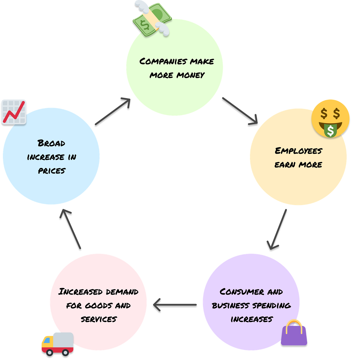 - Wage-Price spirals: When workers demand higher wages to cope with rising prices, businesses may respond by increasing prices to maintain their profit margins. This cycle of wage increases and price hikes can create a loop, contributing to inflation: