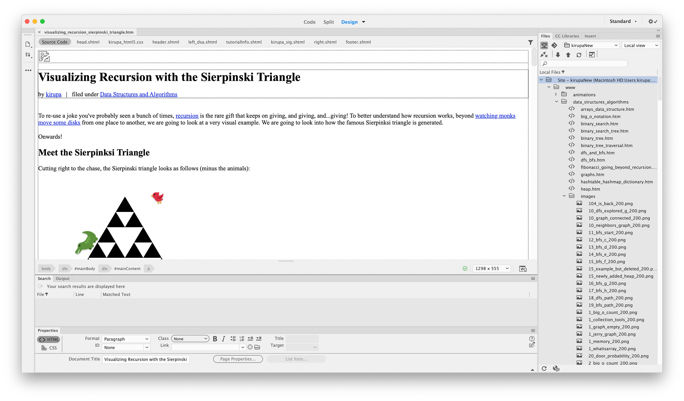 Over these 17-ish minutes, you get to see every step, starting with copying/pasting the content from my draft writeup (from Quip), adding the images from Figma, fixing broken links, and more, all the way to creating the Open Graph metadata, and pushing this Sierpinski Recursion tutorial live. To make this more appealing, I sped up the actual steps by 3x and added some very calming background music! 😀