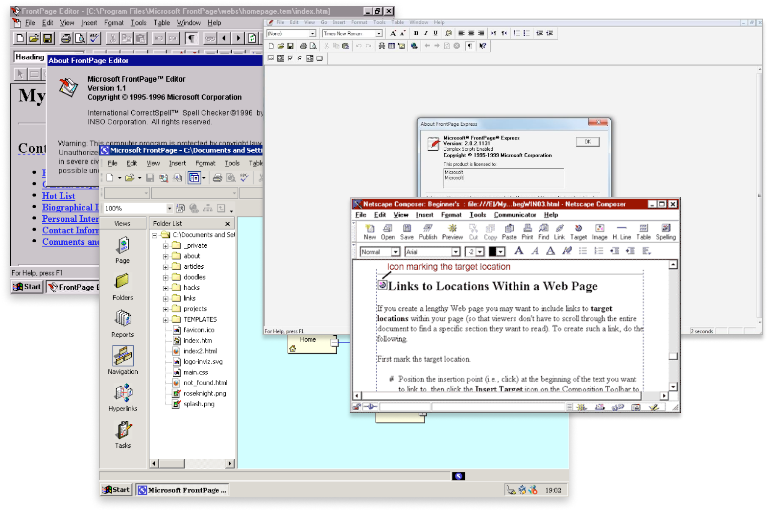To dive into all of these answers, the first thing to note is that this site was started in 1998. The world of web development was very different back then. What was cutting edge was a variation of HTML 3.0, the ability to specify some colors for the background and links, PHP for some backend magic, tables for layout, frames, and the free WYSIWYG web editors like FrontPage Express and Netscape Composer that came bundled with the browsers: