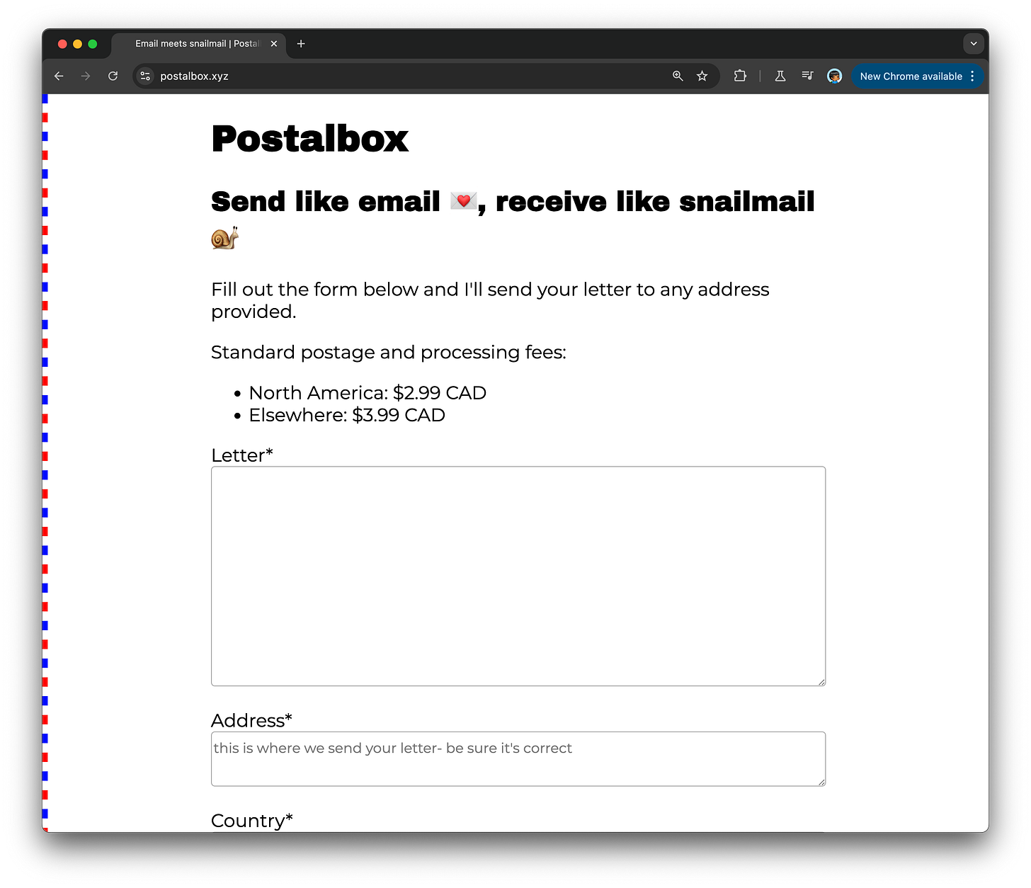 You write a message in your browser and specify a recipient and their physical address. A physical mail with your message printed out gets sent to the recipient. It’s a great and fun example of our analog and digital worlds colliding, so do check it out.